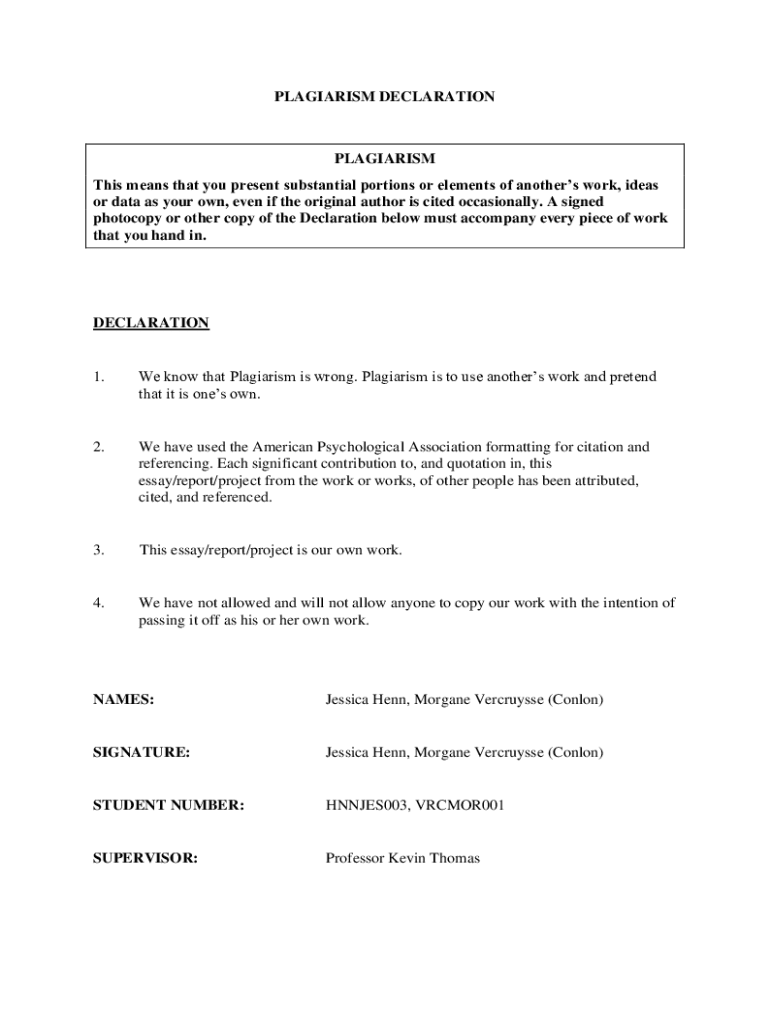 PLAGIARISM DECLARATIONPLAGIARISM This means that you present substantial portions or elements of another work, ideas or data as your own, even if the original author is cited occasionally. A signed
