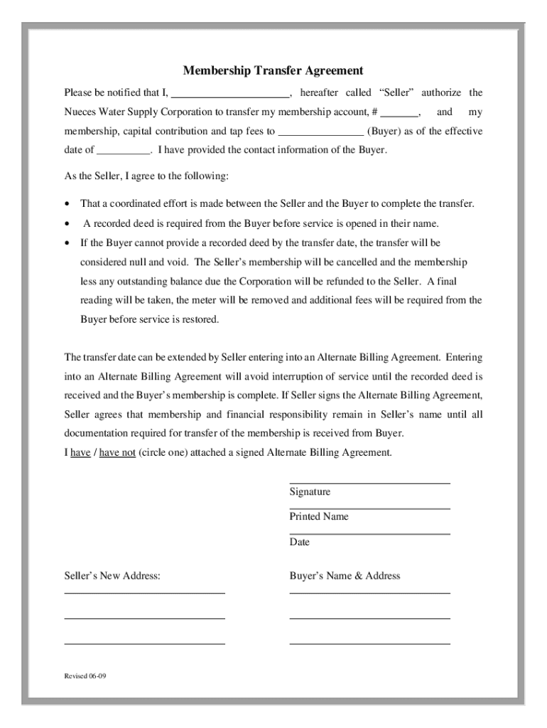 Membership Transfer Agreement Please be notified that I, hereafter called Seller authorize thence Water Supply Corporation to transfer my membership account, #, andmymembership, capital contribution