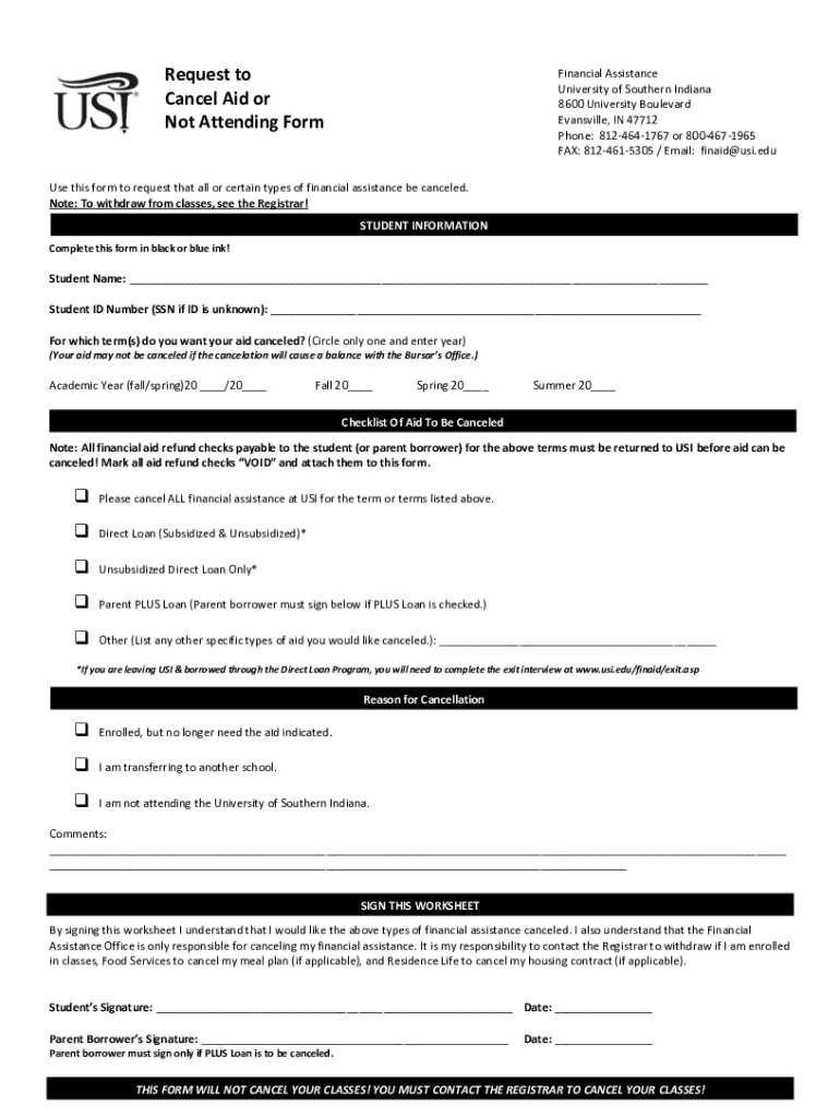 Request to Cancel Aid or Not Attending FormFinancial Assistance University of Southern Indiana 8600 University Boulevard Evansville, IN 47712 Phone: 8124641767 or 8004671965 Faxes: 8124615305 / Email: