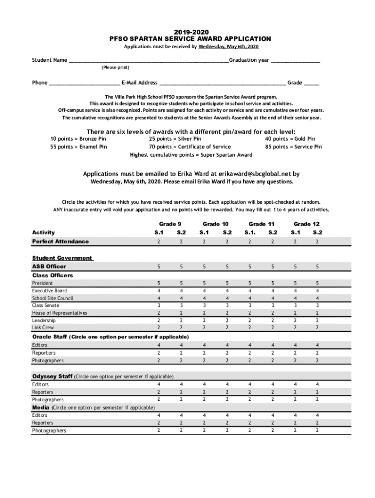 20192020 PESO SPARTAN SERVICE AWARD APPLICATION Applications must be received by Wednesday, May 6th, 2020 Student Name ___Graduation year ___ (Please print)Phone ___ Email Address ___ Grade ___ The