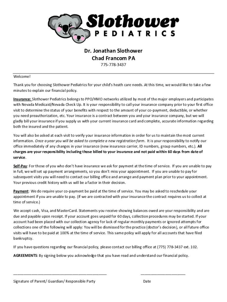 Dr. Jonathan Slower Chad Franco PA 7757783437 Welcome! Thank you for choosing Slower Pediatrics for your children care needs. At this time, we would like to take a few minutes to explain our financial