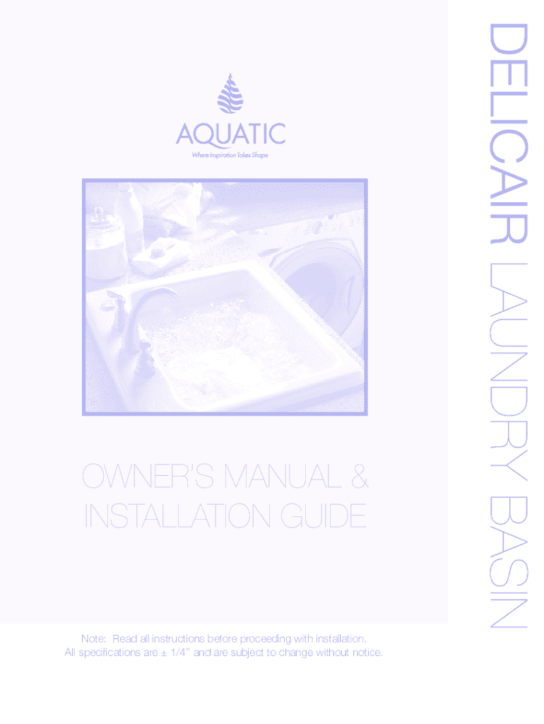 All specifications are 1/4 and are subject to change without notice. DELICATE laundry BASINOwners Manual &