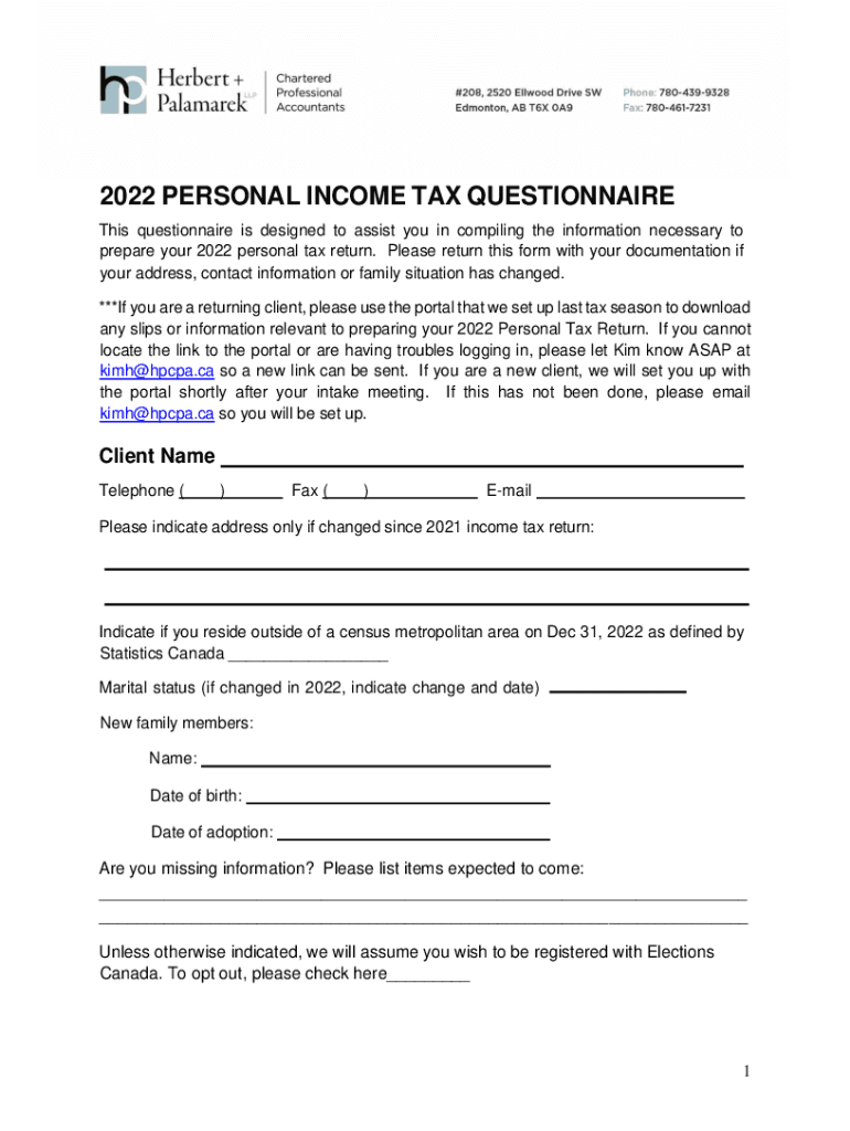 2022 PERSONAL INCOME TAX QUESTIONNAIRE This questionnaire is designed to assist you in compiling the information necessary to prepare your 2022 personal tax return. Please return this form with your