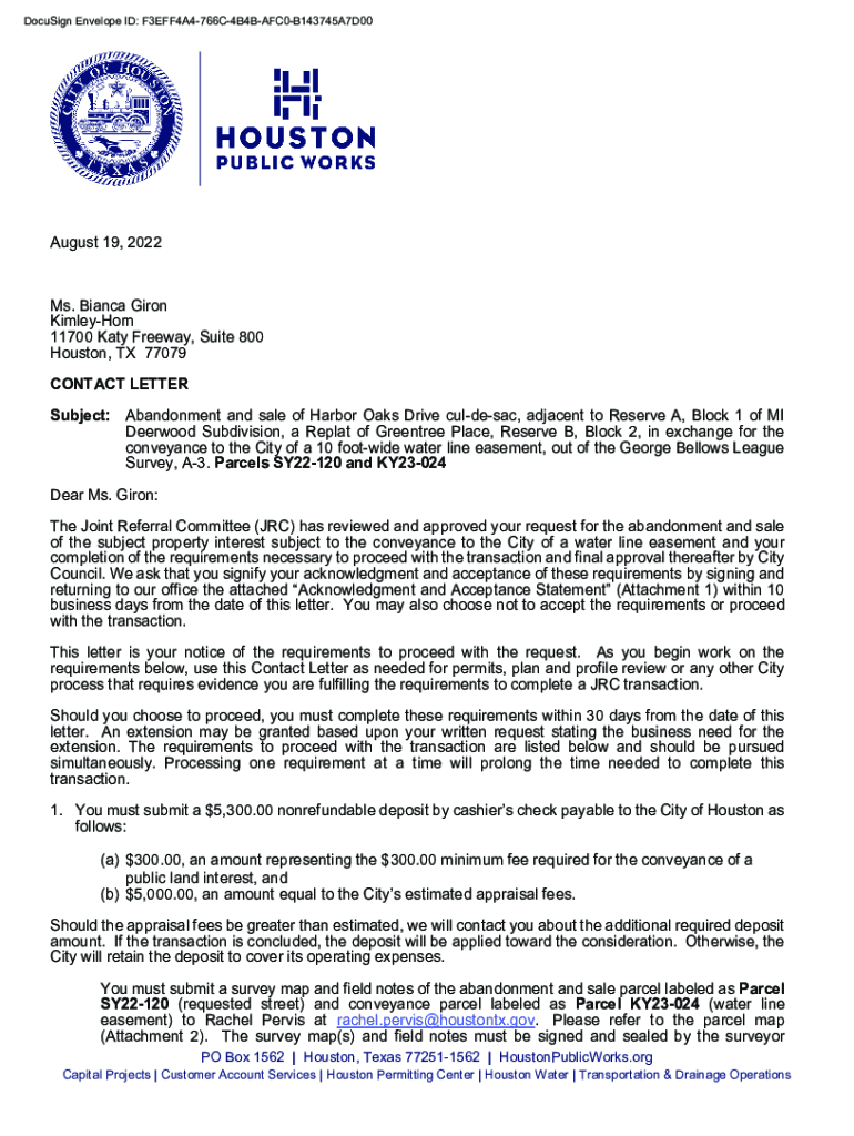 DocuSign Envelope ID: F3EFF4A4766C4B4BAFC0B143745A7D00August 19, 2022Ms. Bianca Iron KimleyHorn 11700 Katy Freeway, Suite 800 Houston, TX 77079 CONTACT LETTER Subject: Abandonment and sale of Harbor