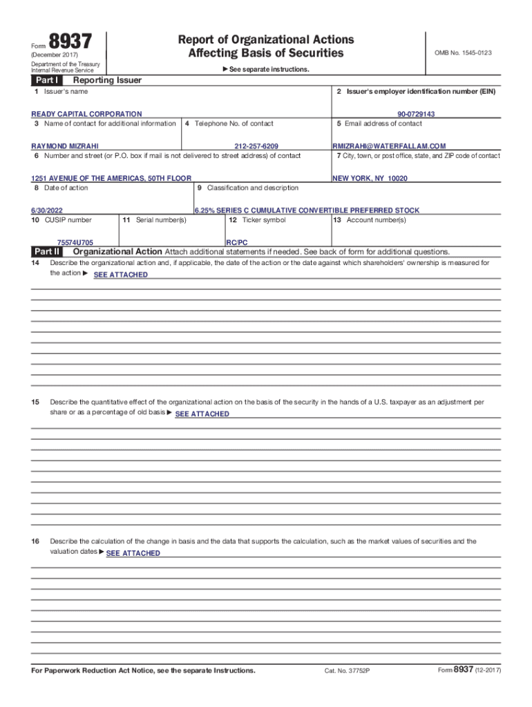 8937Report of Organizational Actions Affecting Basis of SecuritiesForm (December 2017) Department of the Treasury Internal Revenue Serviceman Ia See OMB No. 15450123separate instructions. Reporting