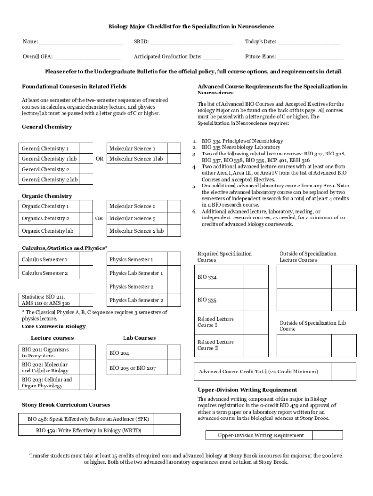 Biology Major Checklist for the Specialization in Neuroscience Name: ___SB ID: ___Today's Date: ___Overall GPA: ___Anticipated Graduation Date: ___Future Plans: ___Please refer to the Undergraduate