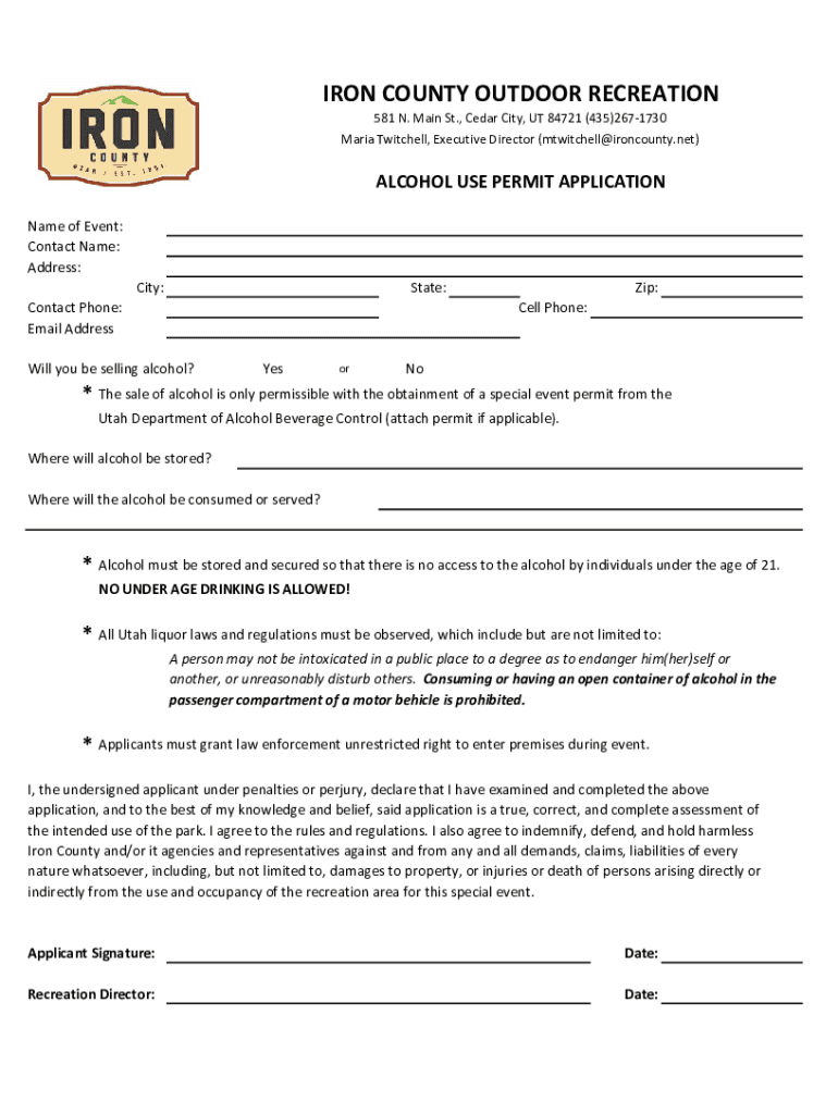 MariaTwitchell, ExecutiveDirector(mtwitchell@ironcounty.net)ALCOHOLUSEPERMITAPPLICATION