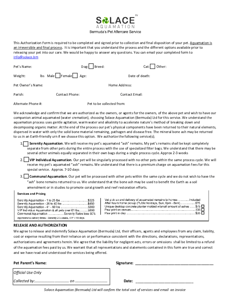 Get the free Authorization For Aquamation Form - Pet Cremation NYC