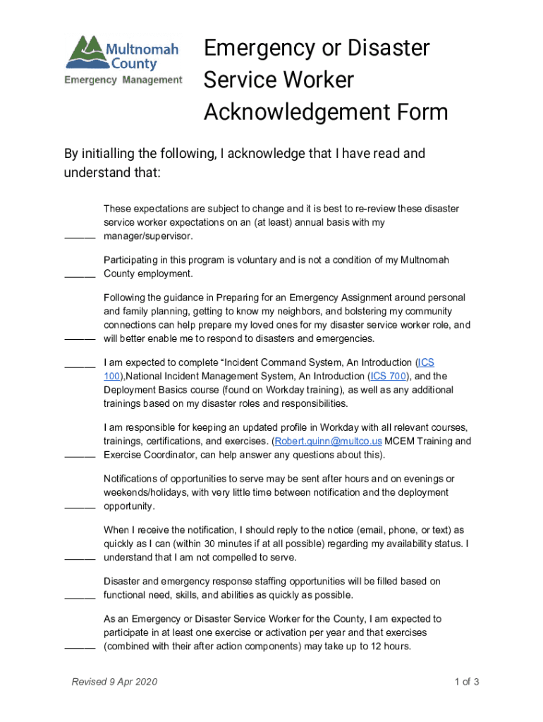 Emergency or Disaster Service Worker Acknowledgement Form By initialing the following, I acknowledge that I have read and understand that: These expectations are subject to change, and it is best