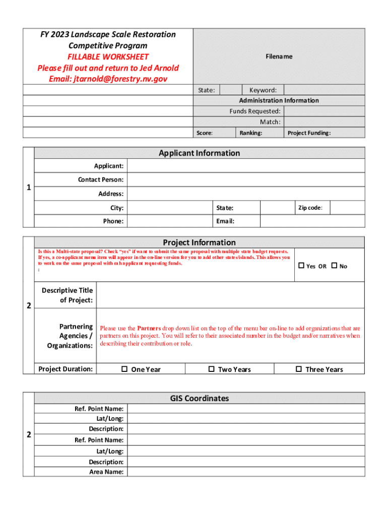 FY 2023 Landscape Scale Restoration Competitive Program FILLABLE WORKSHEET Please fill out and return to Jed Arnold Email: jtarnold@forestry.nv.govFilenameState:Keyword: Administration Information