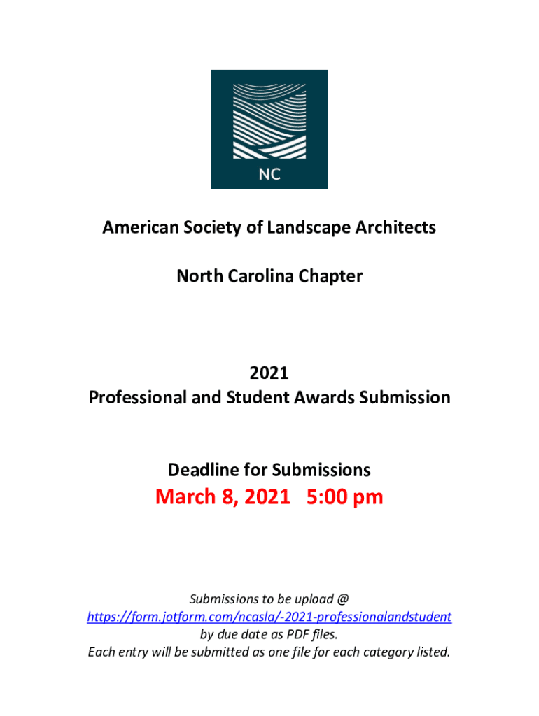 American Society of Landscape Architects North Carolina Chapter2021 Professional and Student Awards SubmissionDeadline for Submissions March 8, 2021 5:00 submissions to be uploaded @ https://form.jotform.com/ncasla/2021professionalandstudent