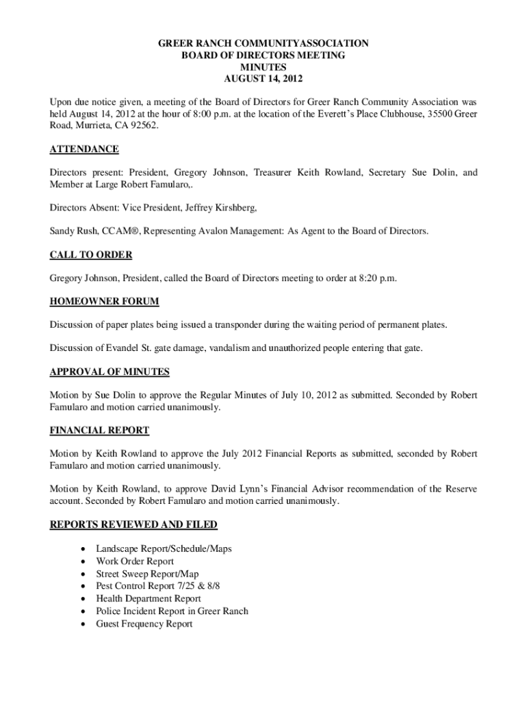 GREER RANCH COMMUNITYASSOCIATION BOARD OF DIRECTORS MEETING MINUTES AUGUST 14, 2012, Upon due notice given, a meeting of the Board of Directors for Greer Ranch Community Association was held August