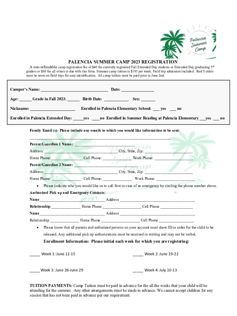 VALENCIA SUMMER CAMP 2023 REGISTRATION A nonrefundable camp registration fee of $40 for currently registered Fall Extended Day students or Extended Day graduating 5th graders or $80 for all others