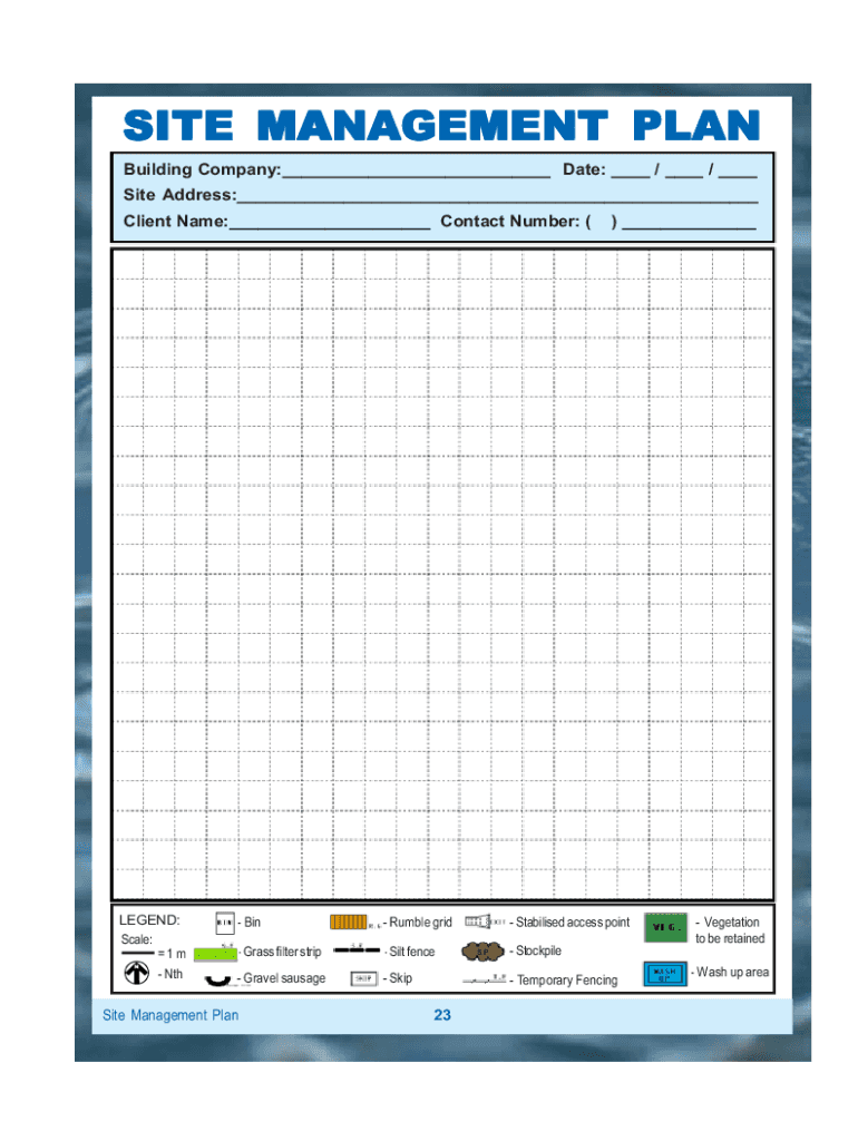 SITE MAN AGENT PLAN MANA Building Company:___ Date: ___ / ___ / ___ Site Address:___ Client Name:___ Contact Number: (LEGEND: Scale: 1 m Nth Bin Rumble grid Grass filter strip Silt fence Gravel sausage