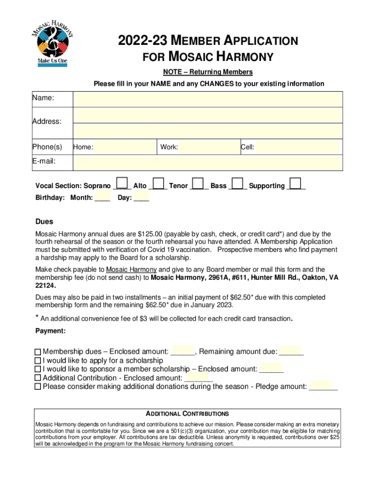 202223 MEMBER APPLICATION FOR MOSAIC HARMONY NOTE Returning Members Please fill in your NAME and any CHANGES to your existing informational: Address: Phone(s)Home:Work:Cell:Email: Vocal Section: Soprano