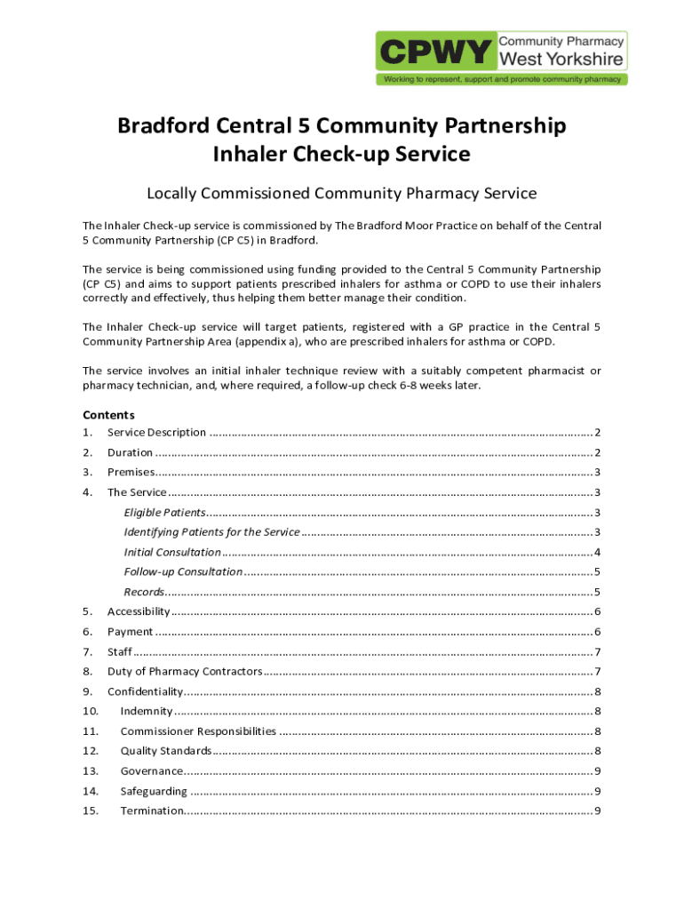 Bradford Central 5 Community Partnership Inhaler Checkup Service Locally Commissioned Community Pharmacy Service The Inhaler Checkup service is commissioned by The Bradford Moor Practice on behalf