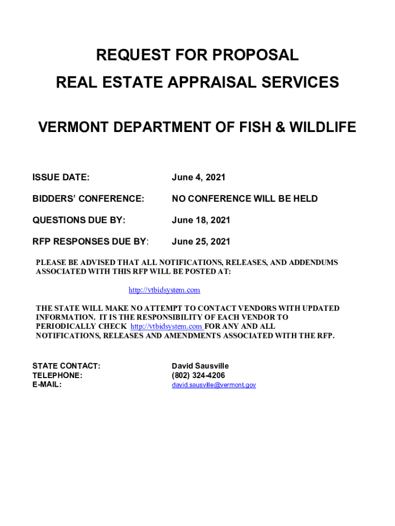 REQUEST FOR PROPOSAL REAL ESTATE APPRAISAL SERVICES VERMONT DEPARTMENT OF FISH & WILDLIFE ISSUE DATE:June 4, 2021BIDDERS CONFERENCE:NO CONFERENCE WILL BE HELDQUESTIONS DUE BY:June 18, 2021RFP RESPONSES