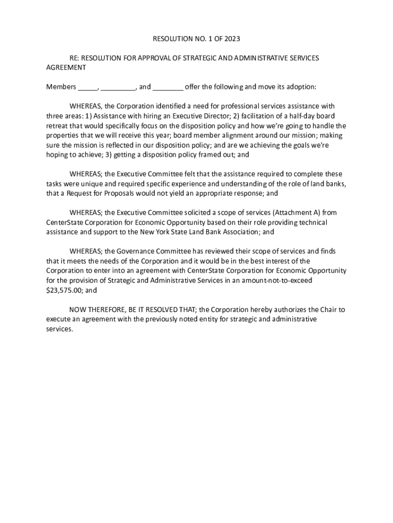 RESOLUTION NO. 1 OF 2023 RE: RESOLUTION FOR APPROVAL OF STRATEGIC AND ADMINISTRATIVE SERVICES AGREEMENT Members ___, ___, and ___ offer the following and move its adoption: WHEREAS, the Corporation