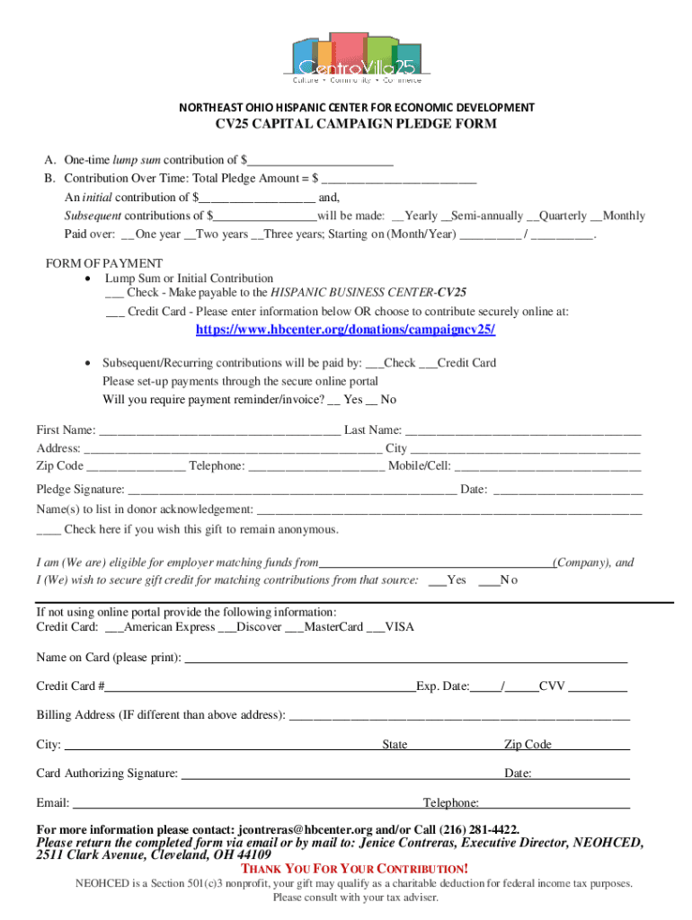NORTHEAST OHIO HISPANIC CENTER FOR ECONOMIC DEVELOPMENTCV25 CAPITAL CAMPAIGN PLEDGE FORM A. Onetime lump sum contribution of $ B. Contribution Over Time: Total Pledge Amount $ ___ An initial contribution