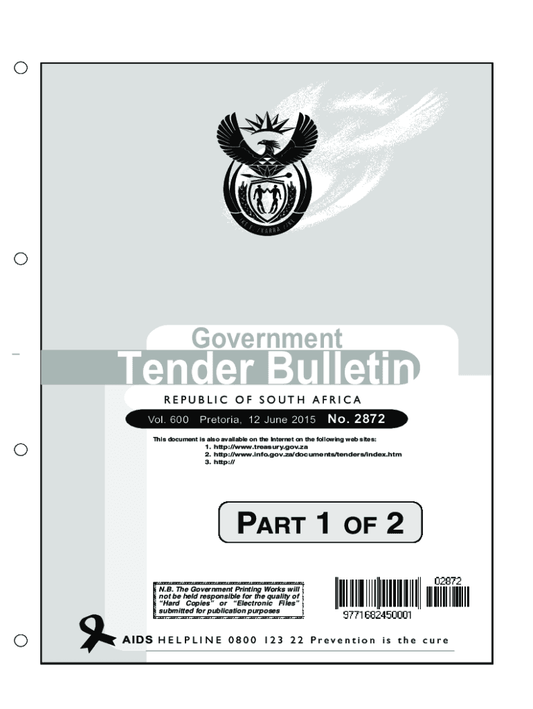 . GovernmentTender Bulletin REPUBLIC E P U B L I C OF FS SOUTH O U T H AFRICA Vol. 600Pretoria,12 June 2015No. 2872This document is also available on the Internet on the following websites: 1. http://www.treasury.gov.za