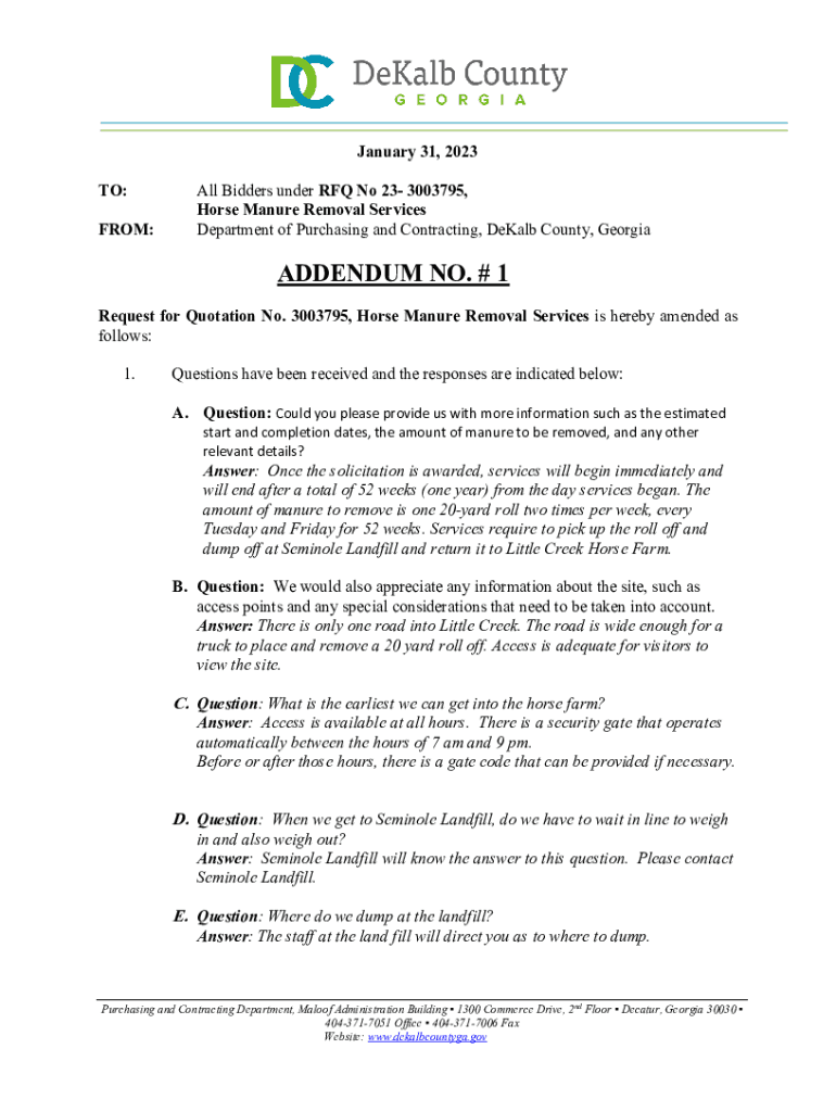 January 31, 2023, TO: FROM:All Bidders under RFQ No 23 3003795, Horse Manure Removal Services Department of Purchasing and Contracting, DeKalb County, GeorgiaADDENDUM NO. # 1 Request for Quotation