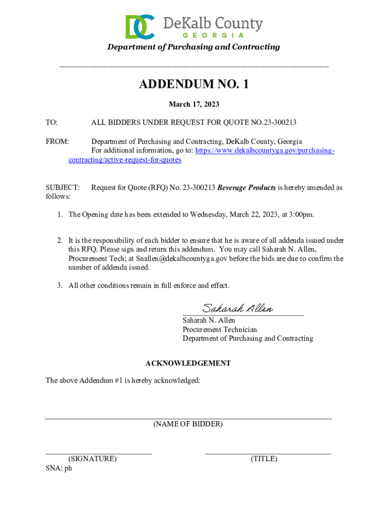 Department of Purchasing and Contracting ___ADDENDUM NO. 1 March 17, 2023, TO:ALL BIDDERS UNDER REQUEST FOR QUOTE NO.23300213FROM:Department of Purchasing and Contracting, DeKalb County, Georgia For