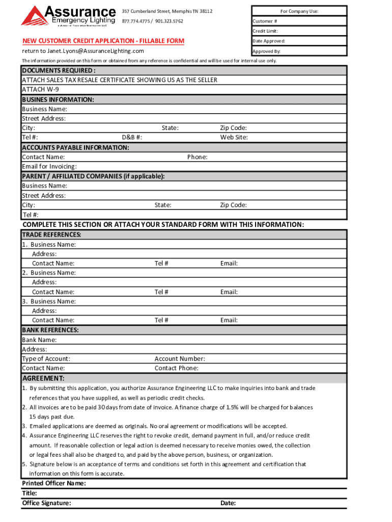 357 Cumberland Street, Memphis TN 38112For Company Use:877.774.4775 / 901.323.5762Customer # Credit Limit:NEW CUSTOMER CREDIT APPLICATION FILLABLE Format Approved:return to Janet.Lyons@AssuranceLighting.comApproved
