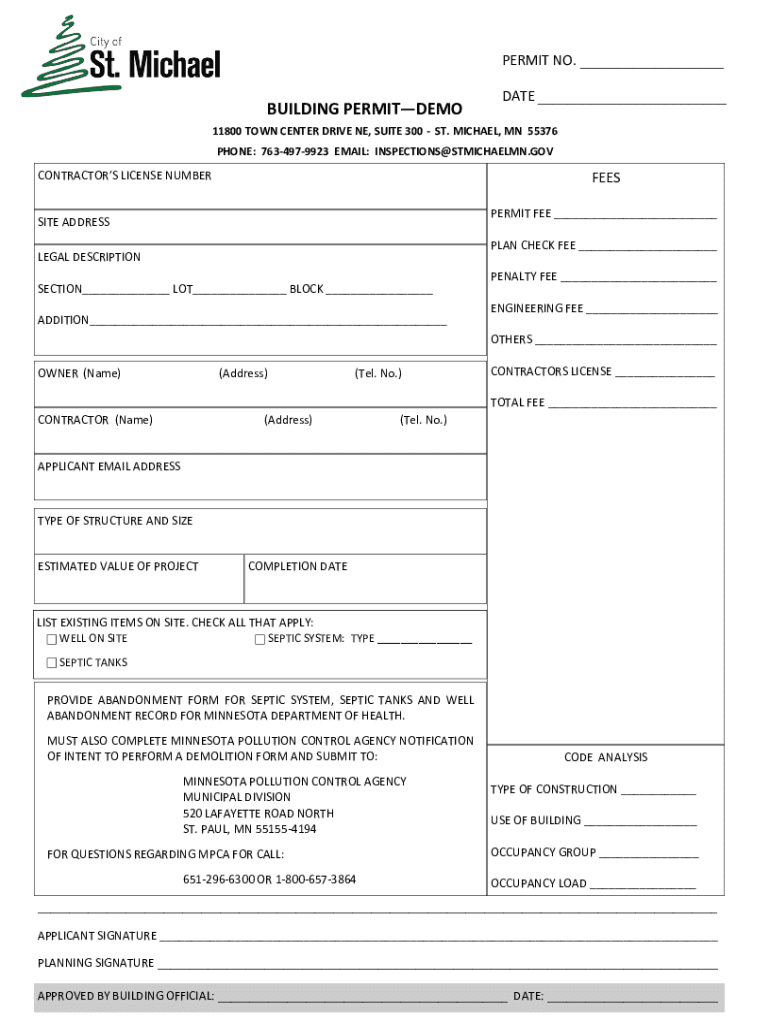PERMIT NO. ___BUILDING PERMITDEMODATE ___11800 TOWN CENTER DRIVE NE, SUITE 300 ST. MICHAEL, MN 55376 PHONE: 7634979923 EMAIL: INSPECTIONS@STMICHAELMN.GOVCONTRACTORS LICENSE NUMBERLESS PERMIT FEE ___SITE