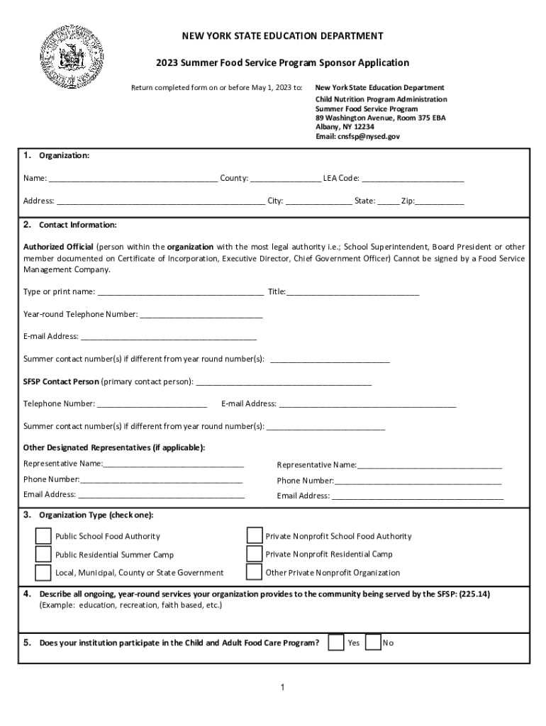 NEW YORK STATE EDUCATION DEPARTMENT 2023 Summer Food Service Program Sponsor Application Return completed form on or before May 1, 2023, to:New York State Education Department Child Nutrition Program