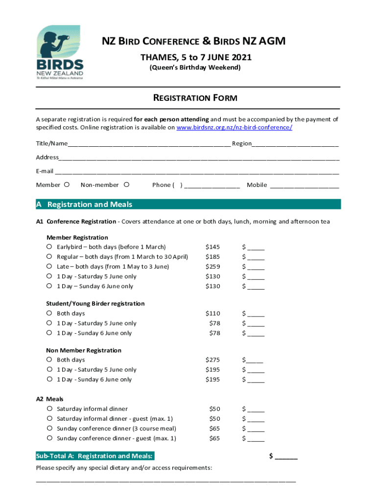 NZ BIRD CONFERENCE & BIRDS NZ AGM THAMES, 5 to 7 JUNE 2021 (Queens Birthday Weekend)REGISTRATION FORM A separate registration is required for each person attending and must be accompanied by the payment
