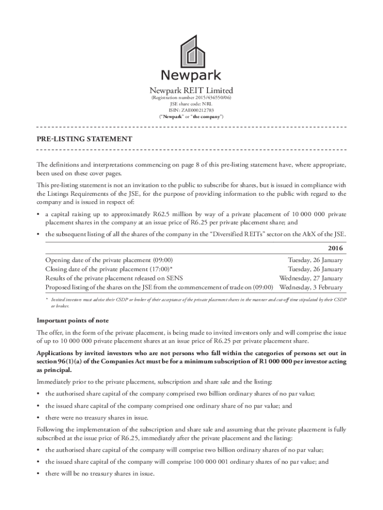Newark REIT Limited (Registration number 2015/436550/06) USE share code: NRL ISIN: ZAE000212783 (Newark or the company)RELISTING STATEMENT The definitions and interpretations commencing on page8 of