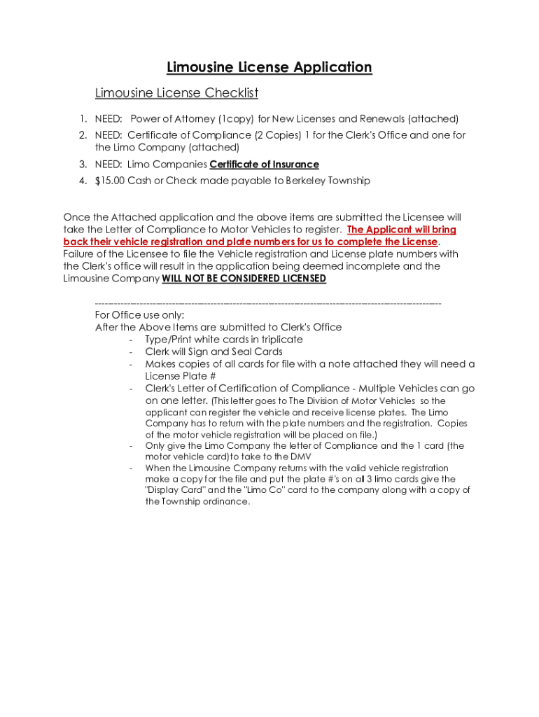 Limousine License Application Limousine License Checklist 1. NEED: Power of Attorney (1copy) for New Licenses and Renewals (attached) 2. NEED: Certificate of Compliance (2 Copies) 1 for the Clerk\'s