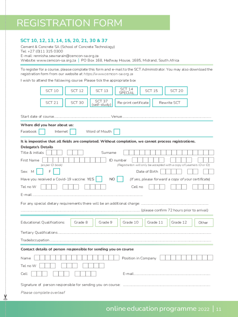 REGISTRATION FORM SET 10, 12, 13, 14, 15, 20, 21, 30 & 37 Cement & Concrete SA (School of Concrete Technology) Tel: +27 (0)11 315 0300 Email: rennisha.sewnarain@cemconsa.org.za Website: www.cemconsa.org.za