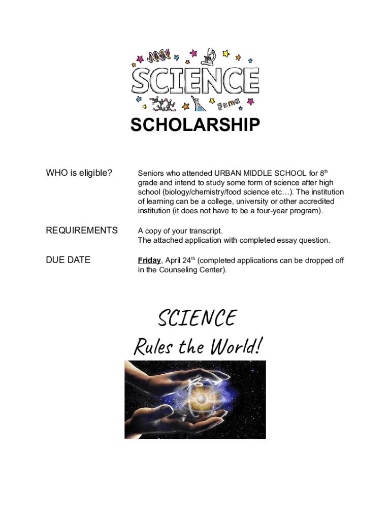 SCHOLARSHIP WHO is eligible? Seniors who attended URBAN MIDDLE SCHOOL for 8th grade and intend to study some form of science after high school (biology/chemistry/food science etc). The institution