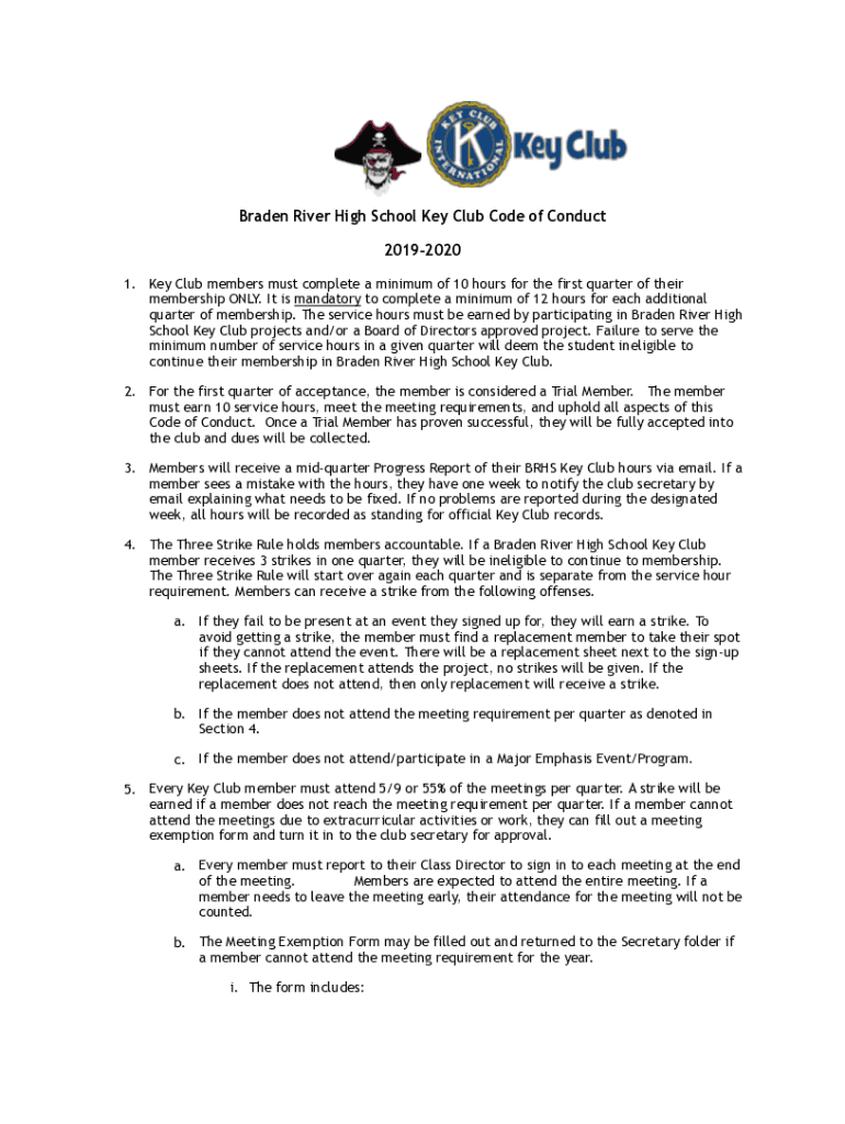 Get the free 19-20 Code Of Conduct - BRADEN RIVER HIGH SCHOOL KEY CLUB