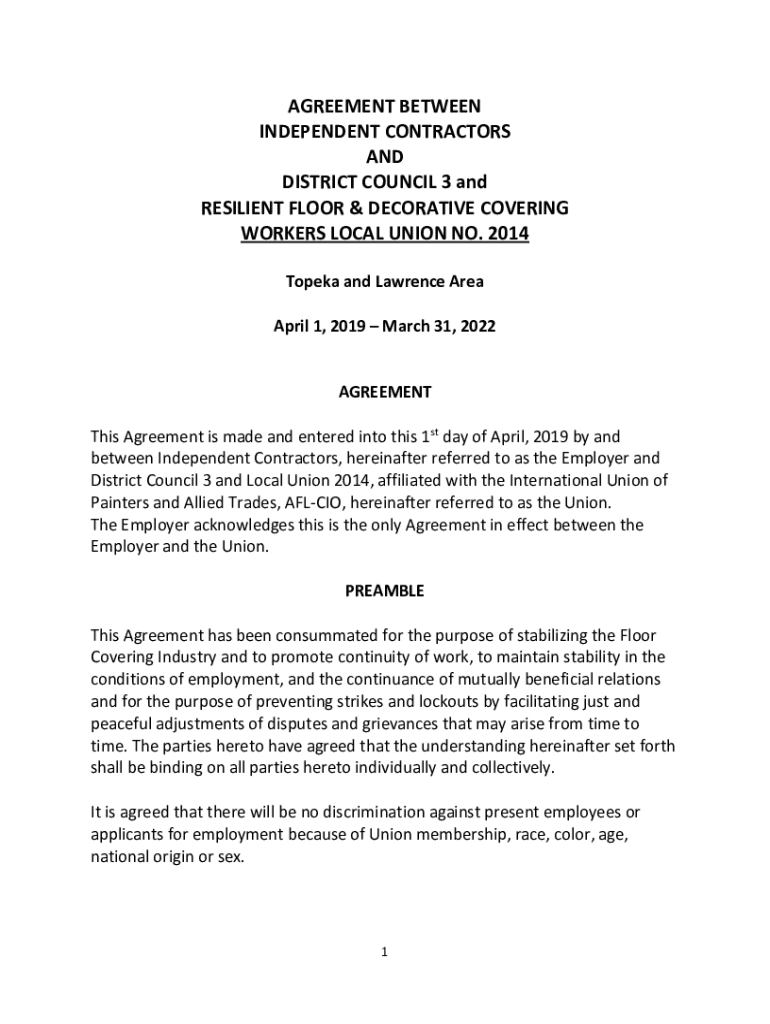 AGREEMENT BETWEEN INDEPENDENT CONTRACTORS AND DISTRICT COUNCIL 3 and RESILIENT FLOOR & DECORATIVE COVERING WORKERS LOCAL UNION NO. 2014 Topeka and Lawrence Area April 1, 2019, March 31, 2022, AGREEMENT