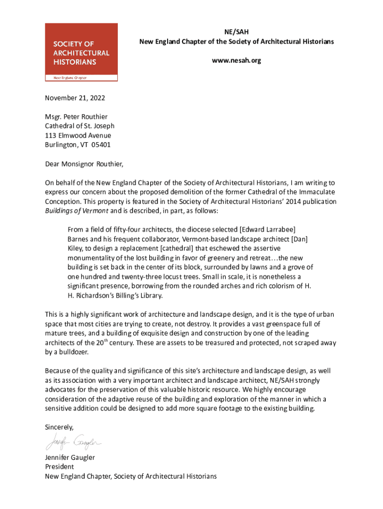 NE/SAH New England Chapter of the Society of Architectural Historians www.nesah.orgNovember 21, 2022 Msgr. Peter Mouthier Cathedral of St. Joseph 113 Elmwood Avenue Burlington, VT 05401 Dear Monsignor