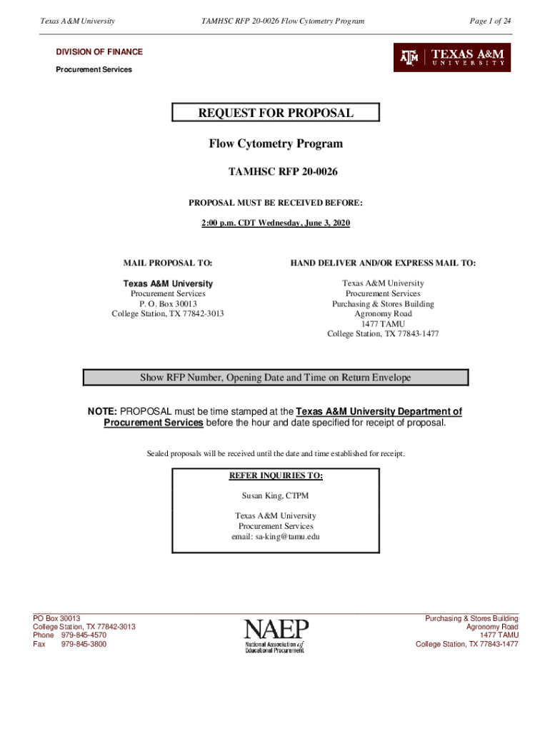 Texas A&M UniversityTAMHSC RFP 200026 Flow Cytometry Program Page 1 of 24DIVISION OF FINANCE Procurement ServicesREQUEST FOR PROPOSAL Flow Cytometry Program TA MHSC RFP 200026 PROPOSAL MUST BE RECEIVED