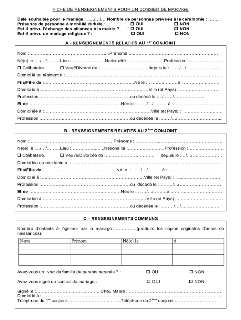 FICHE DE REASSIGNMENTS POUR UN DOSSIER DE MARRIAGE Date suite pour LE marriage :.// Hombre DE personnel argues la Cronin :. O OUI o NON Presence DE personnel mobility route : o NON ESTIA PRU change