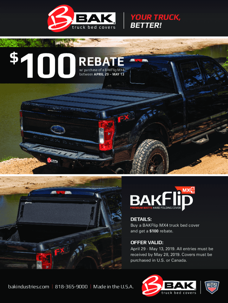 YOUR TRUCK, BETTER!$100REBATEw/ purchase of a Backflip MX4 between APRIL 29 MAY 13DETAILS: Buy a Backflip MX4 truck bed cover and get a $100 rebate. OFFER VALID: April 29 May 13, 2019. All entries