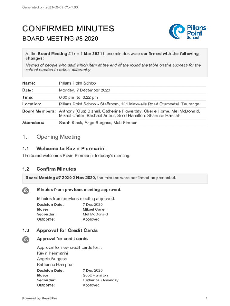 Generated on: 20210309 07:41:00CONFIRMED MINUTES BOARD MEETING #8 2020 At the Board Meeting #1 on 1 Mar 2021 these minutes were confirmed with the following changes: Names of people who said which