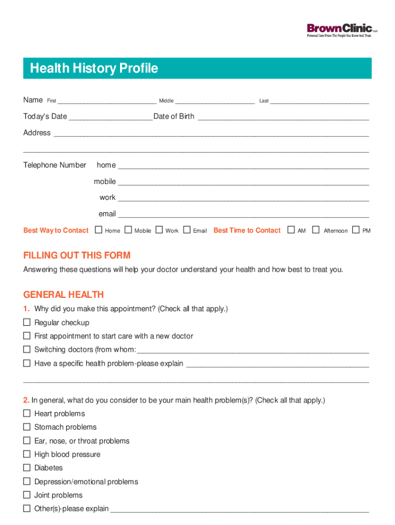 Health History Profile NameFirst___ Middle___ Last___Today\'s Date ___ Date of Birth___ Address______ _ Telephone Number home___ mobile___ work___ _ email___Best Way to ContactHomeMobileWorkEmailBest