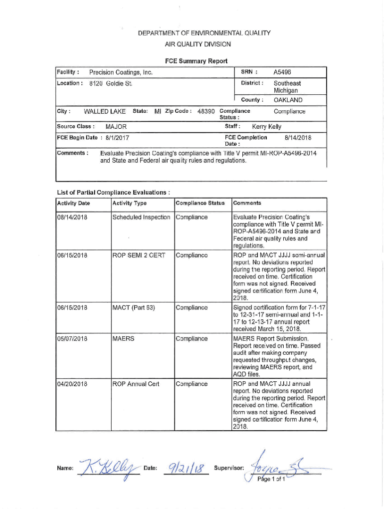 DEPARTMENT OF ENVIRONMENTAL QUALITY AIR QUALITY DIVISION FCE Summary Report Facility :Precision Coatings, Inc.SON:A5496Location:8120 Goldie St. District :Southeast MichiganCounty:OAKLANDCity:WALLED
