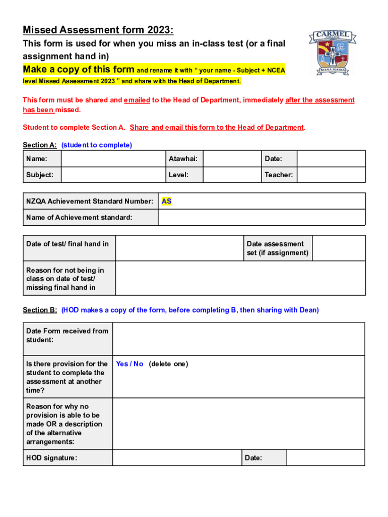Missed Assessment form 2023: This form is used for when you miss an in class test (or a final assignment hand in)Make a copy of this form and rename it with your name Subject + NCAA level Missed Assessment