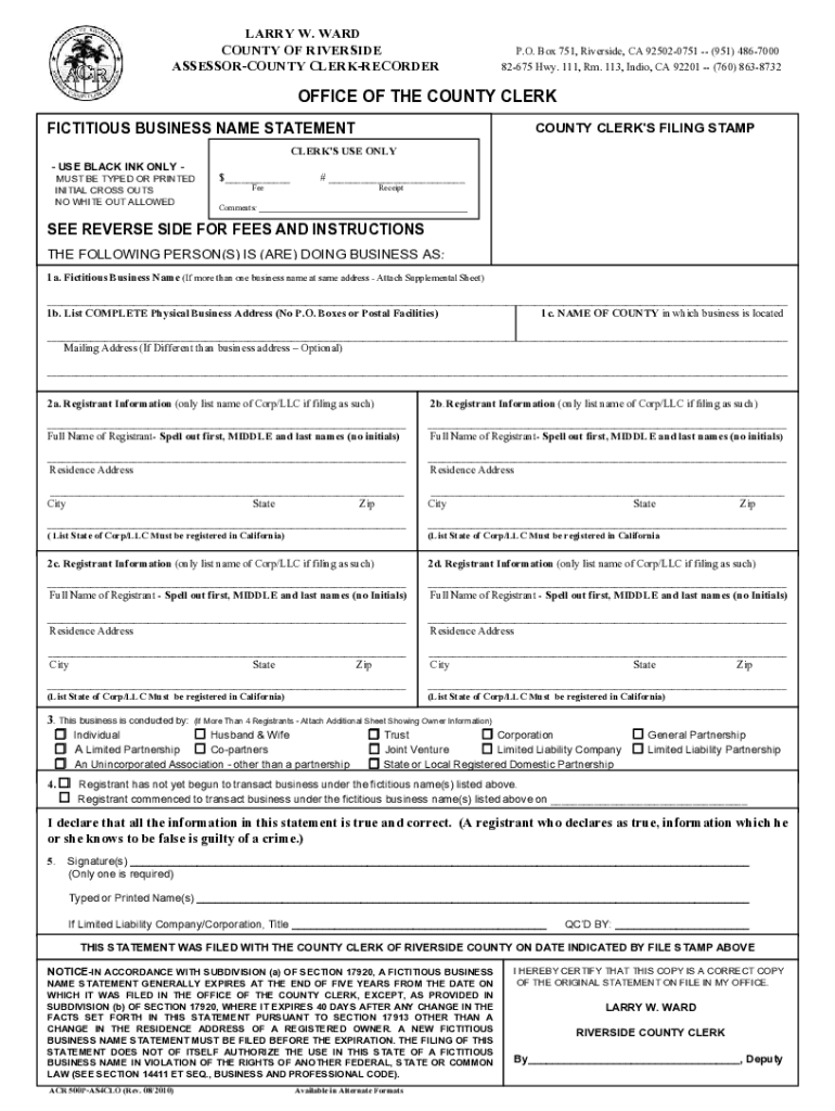 LARRY W. WARD COUNTY OF RIVERSIDE ASSESSORCOUNTY CLERKRECORDERP. O. Box 751, Riverside, CA 925020751 (951) 4867000 82675 Hwy. 111, Rm. 113, Indio, CA 92201 (760) 8638732OFFICE OF THE COUNTY CLERK\'S