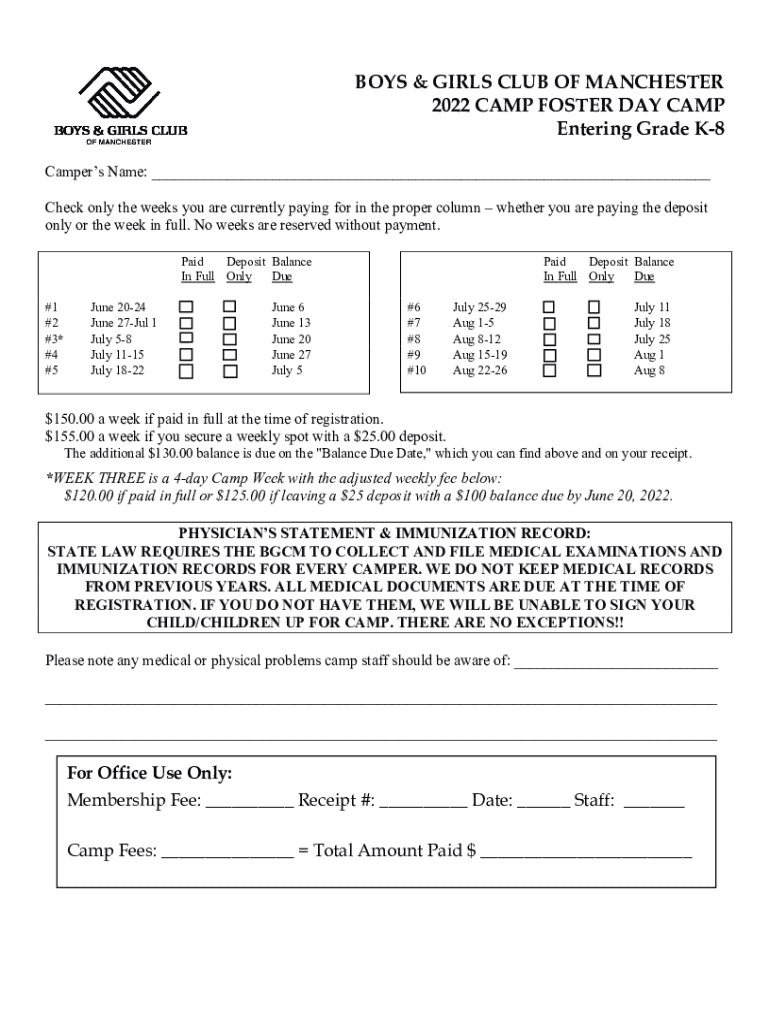 BOYS & GIRLS CLUB OF MANCHESTER 2022 CAMP FOSTER DAY CAMP Entering Grade K8 Campers Name: ___ Check only the weeks you are currently paying for in the proper column whether you are paying the deposit