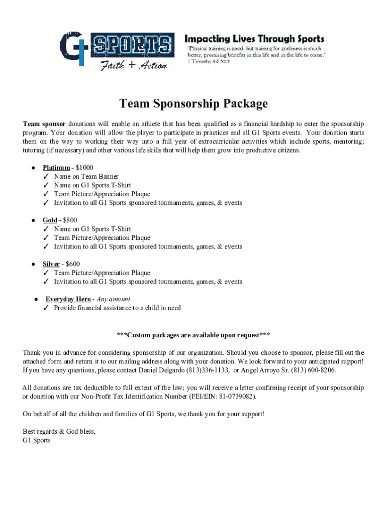 Team Sponsorship Package Team sponsor donations will enable an athlete that has been qualified as a financial hardship to enter the sponsorship program. Your donation will allow the player to participate