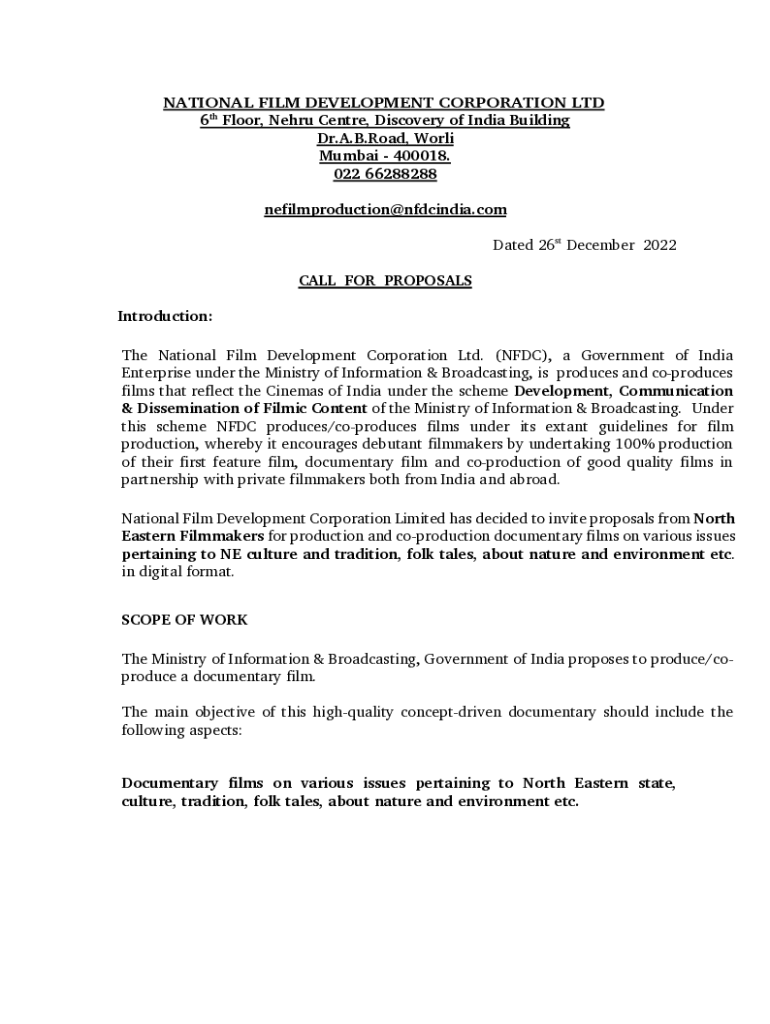 NATIONAL FILM DEVELOPMENT CORPORATION LTD 6th Floor, Nehru Center, Discovery of India Building Dr. A.B. Road, World Mumbai 400018. 022 66288288 nefilmproduction@nfdcindia.com Dated 26th December 2022