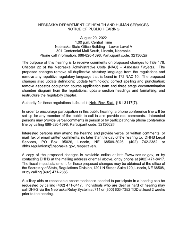 NEBRASKA DEPARTMENT OF HEALTH AND HUMAN SERVICES NOTICE OF PUBLIC HEARING August 29, 2022 1:00 p.m. Central Time Nebraska State Office Building Lower Level A 301 Centennial Mall South, Lincoln, Nebraska