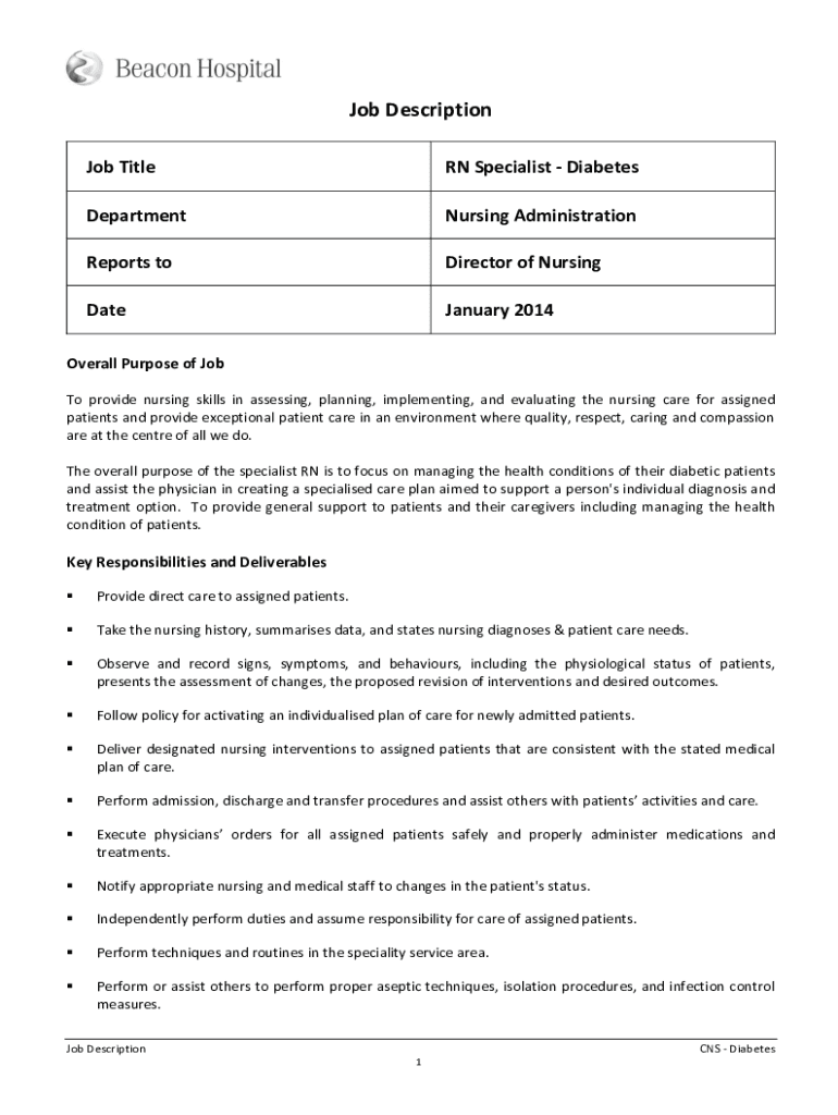 Job Description Job Title RN Specialist DiabetesDepartmentNursing AdministrationReports director of NursingDateJanuary 2014Overall Purpose of Job To provide nursing skills in assessing, planning,